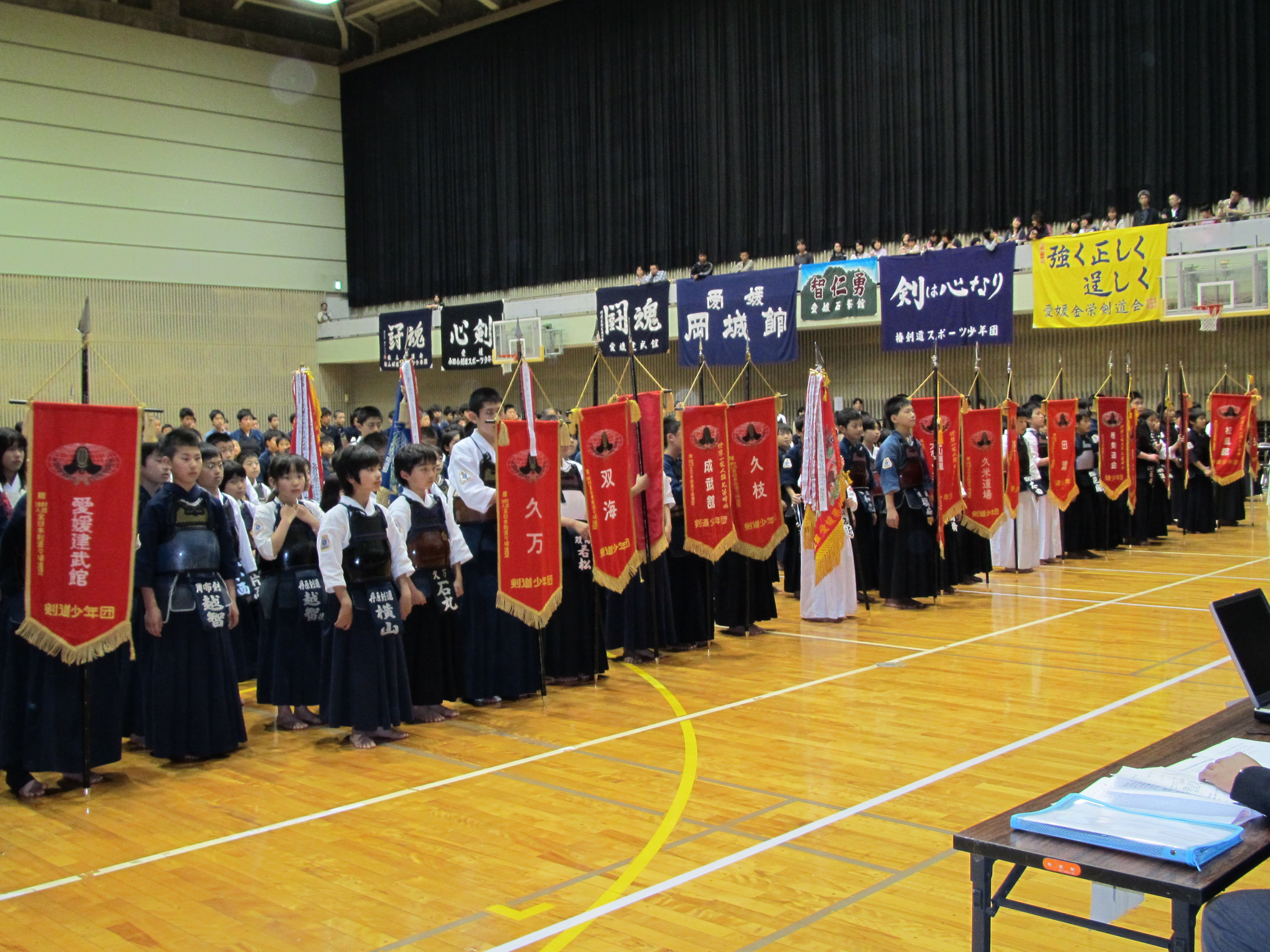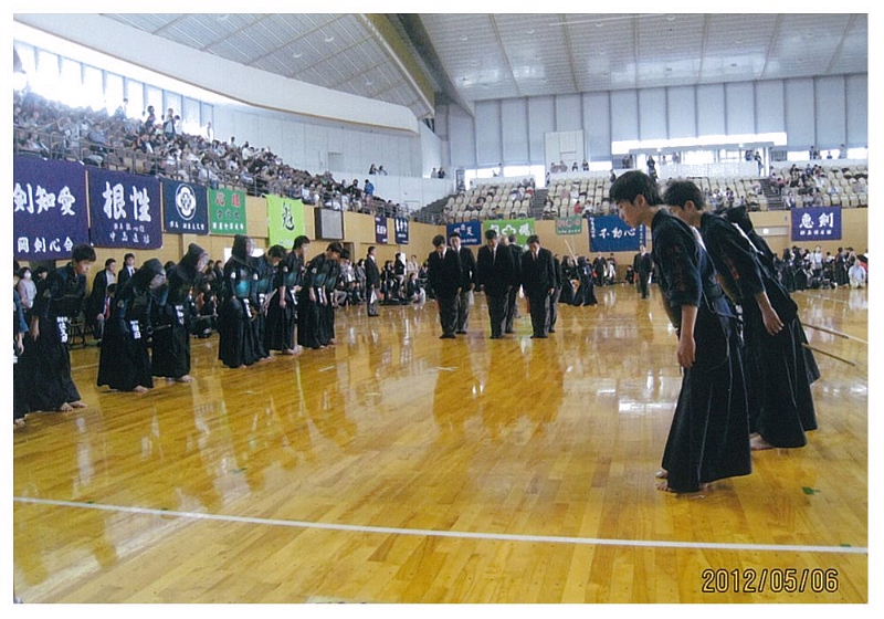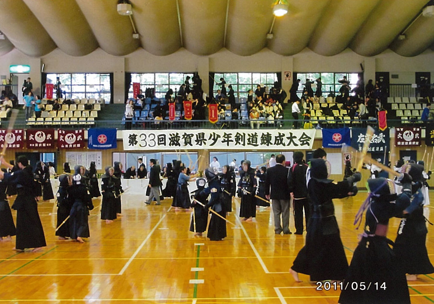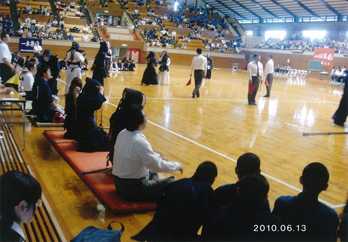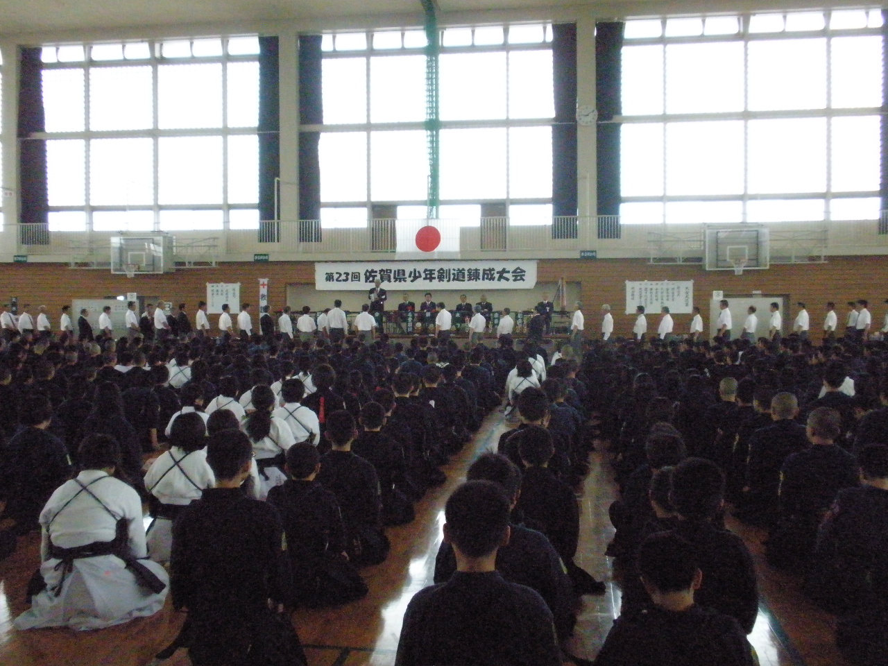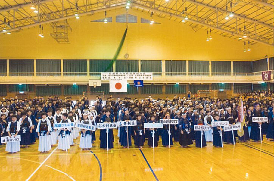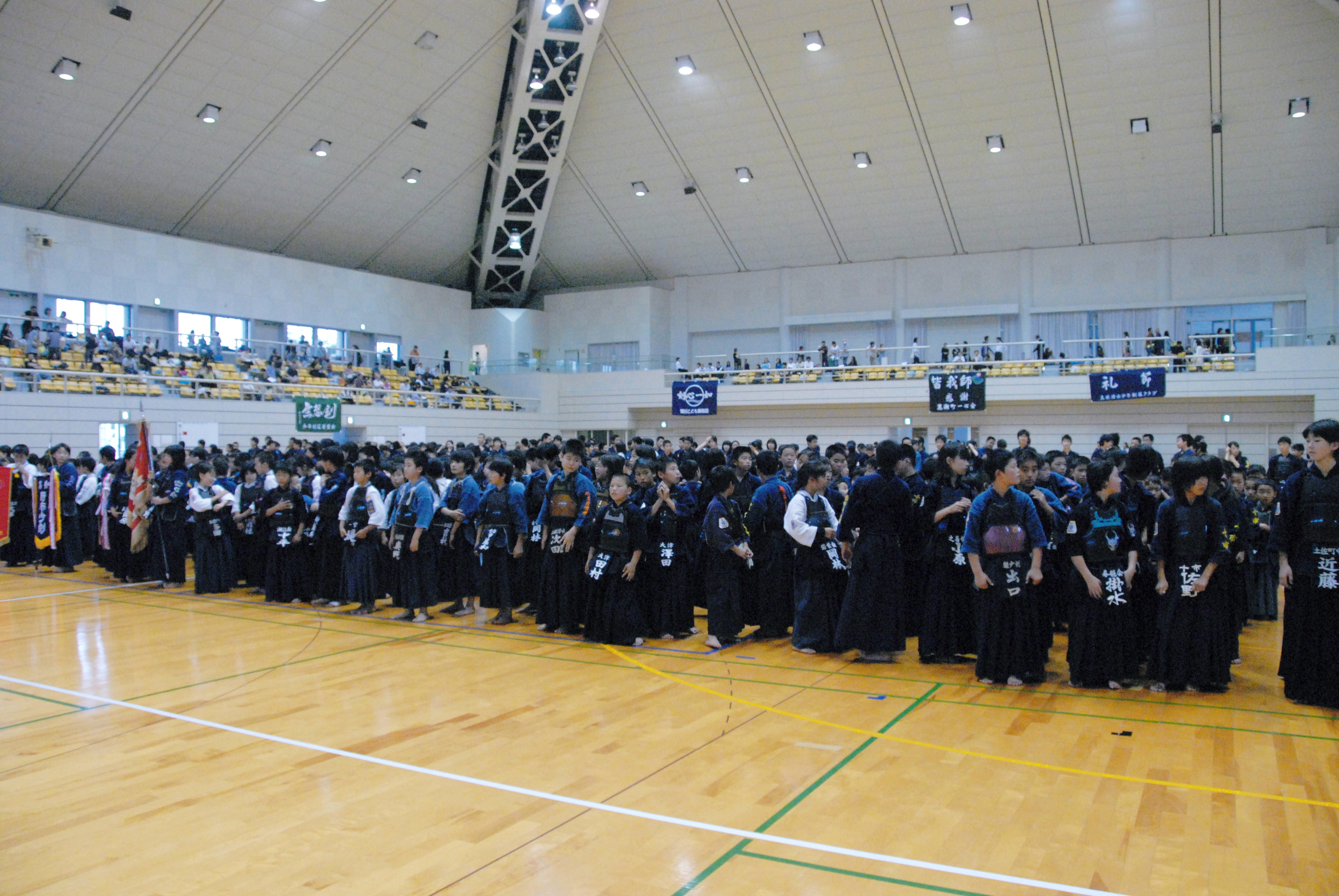 | 大会当日6月6日(日)午前7時己斐鯉城館父兄37名、広銀の森体育館に集合し、受付の準備にかかる。8時50分審判会議、9時10分開会に先立ち、優秀剣道少年団員の表彰を行った。9時25分国武理事長の開会宣言、国家斉唱、優勝旗返還、名越会長挨拶、山田議員の祝辞、會田審判長の説辞、桐木選手の宣誓の後、女子個人戦より試合に入った。16時50分試合が終了し、表彰の後、審判員の講評、山中副会長の挨拶、国武理事長の閉会宣言の後、鯉城館々員により、後片付けを行い7時10分無事終了致しました。 |