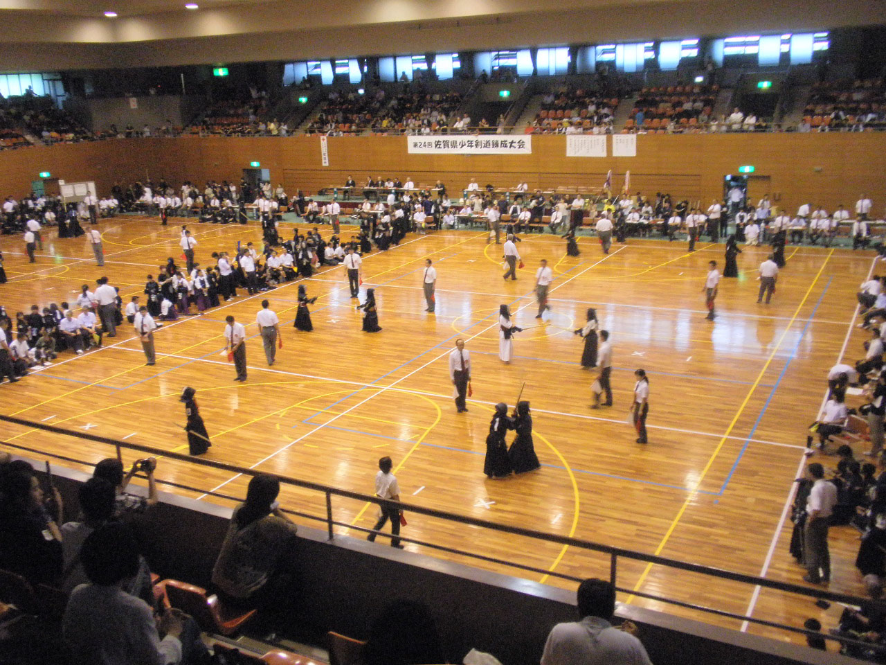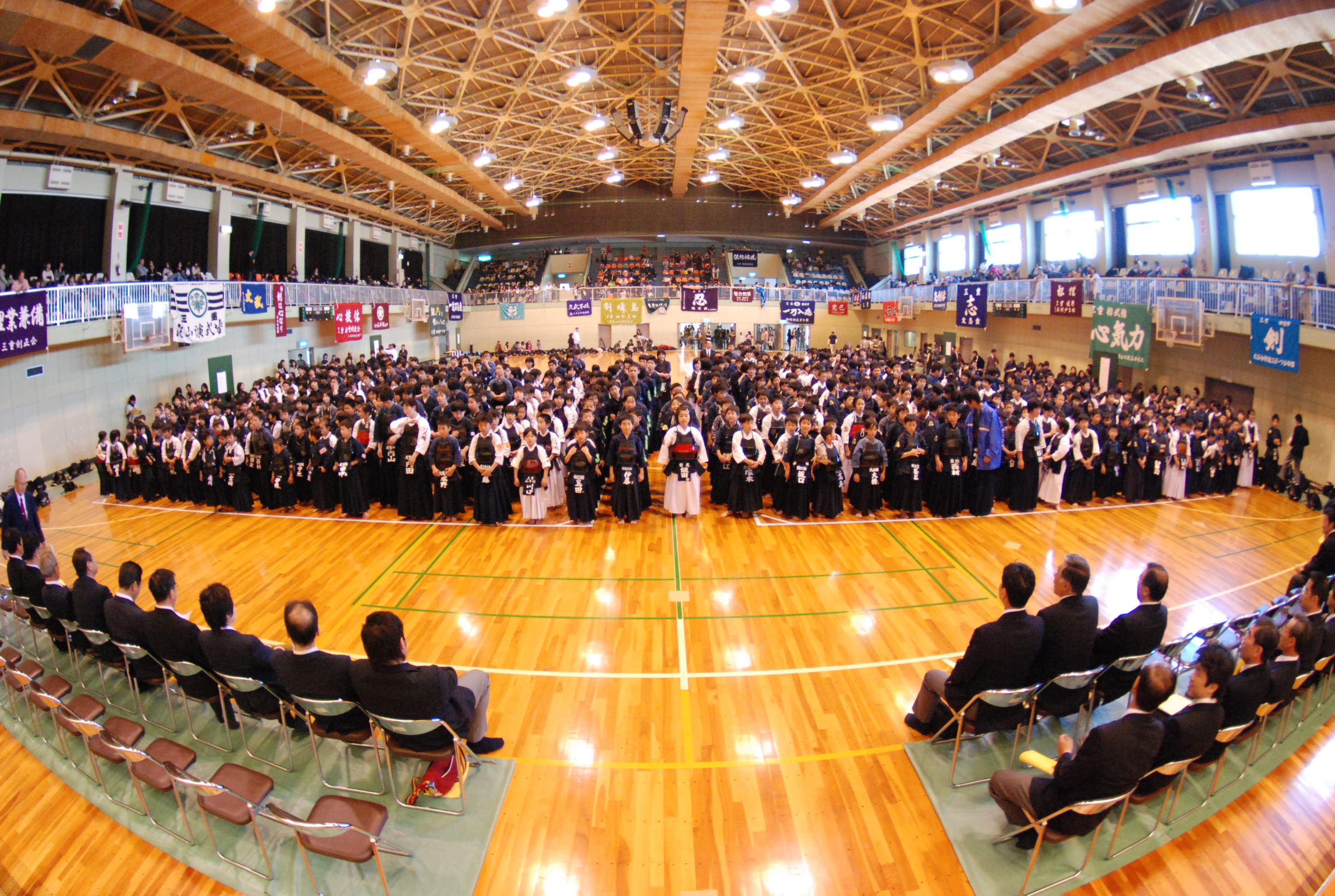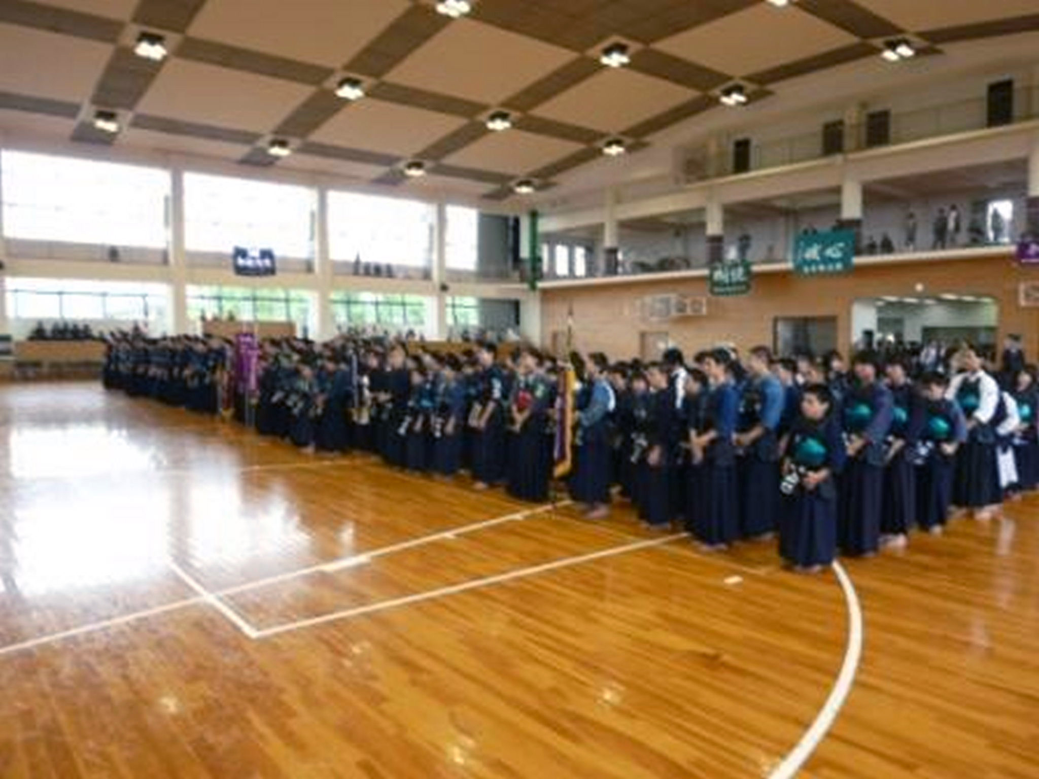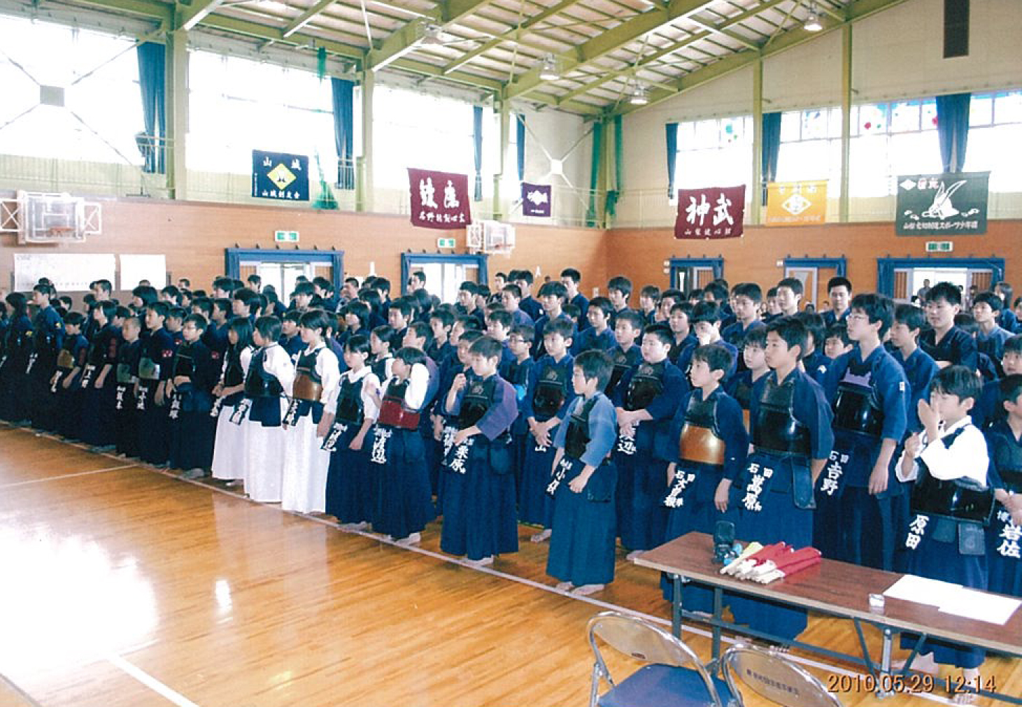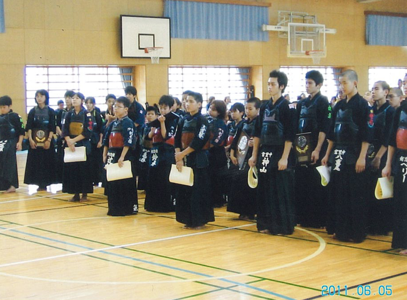 | 大会当日6月6日(日)午前7時己斐鯉城館父兄37名、広銀の森体育館に集合し、受付の準備にかかる。8時50分審判会議、9時10分開会に先立ち、優秀剣道少年団員の表彰を行った。9時25分国武理事長の開会宣言、国家斉唱、優勝旗返還、名越会長挨拶、山田議員の祝辞、會田審判長の説辞、桐木選手の宣誓の後、女子個人戦より試合に入った。16時50分試合が終了し、表彰の後、審判員の講評、山中副会長の挨拶、国武理事長の閉会宣言の後、鯉城館々員により、後片付けを行い7時10分無事終了致しました。 |
