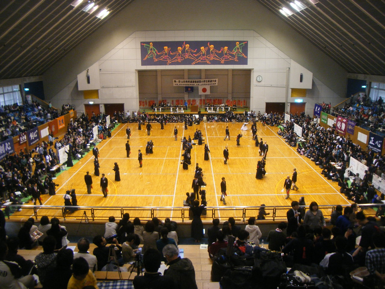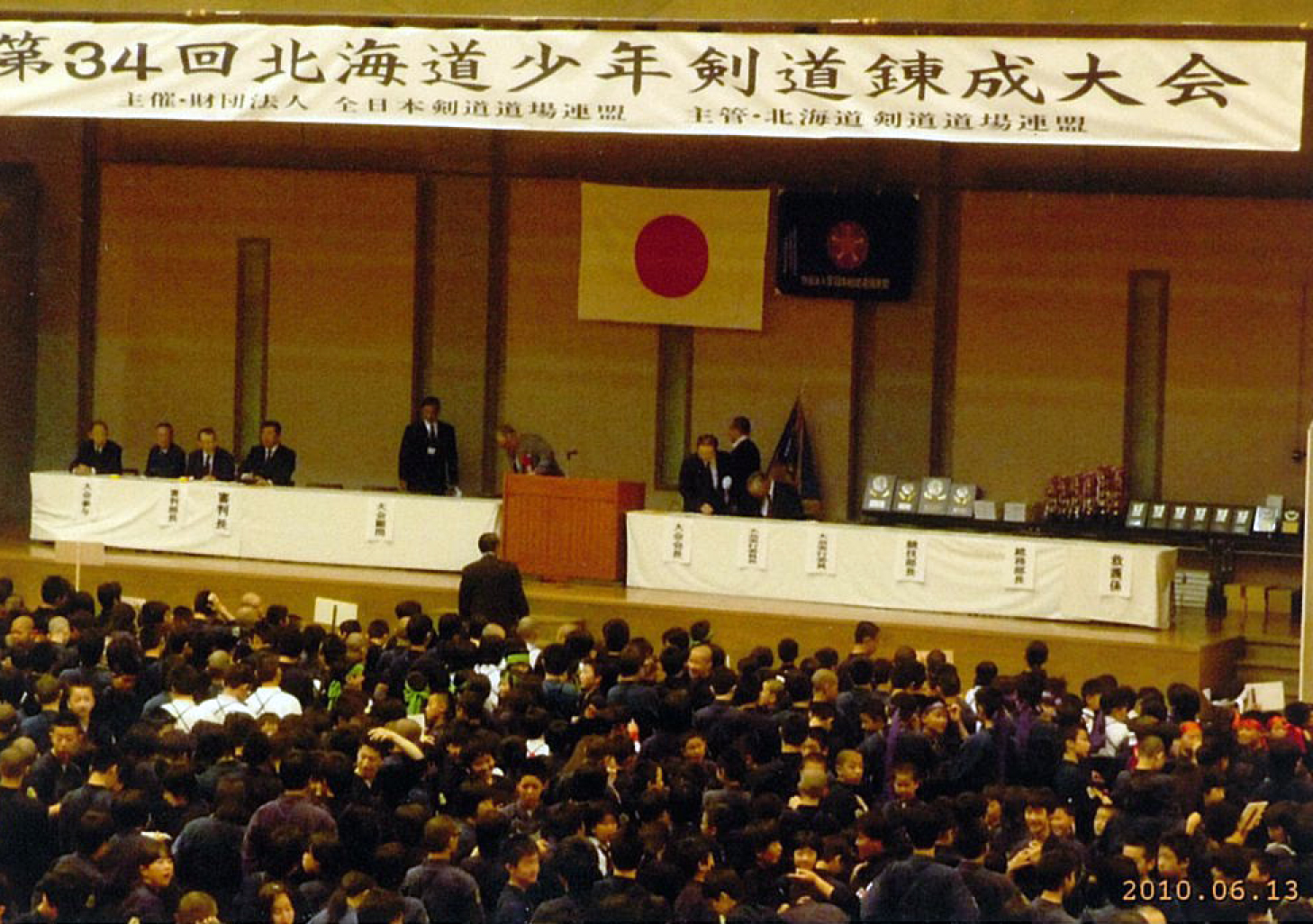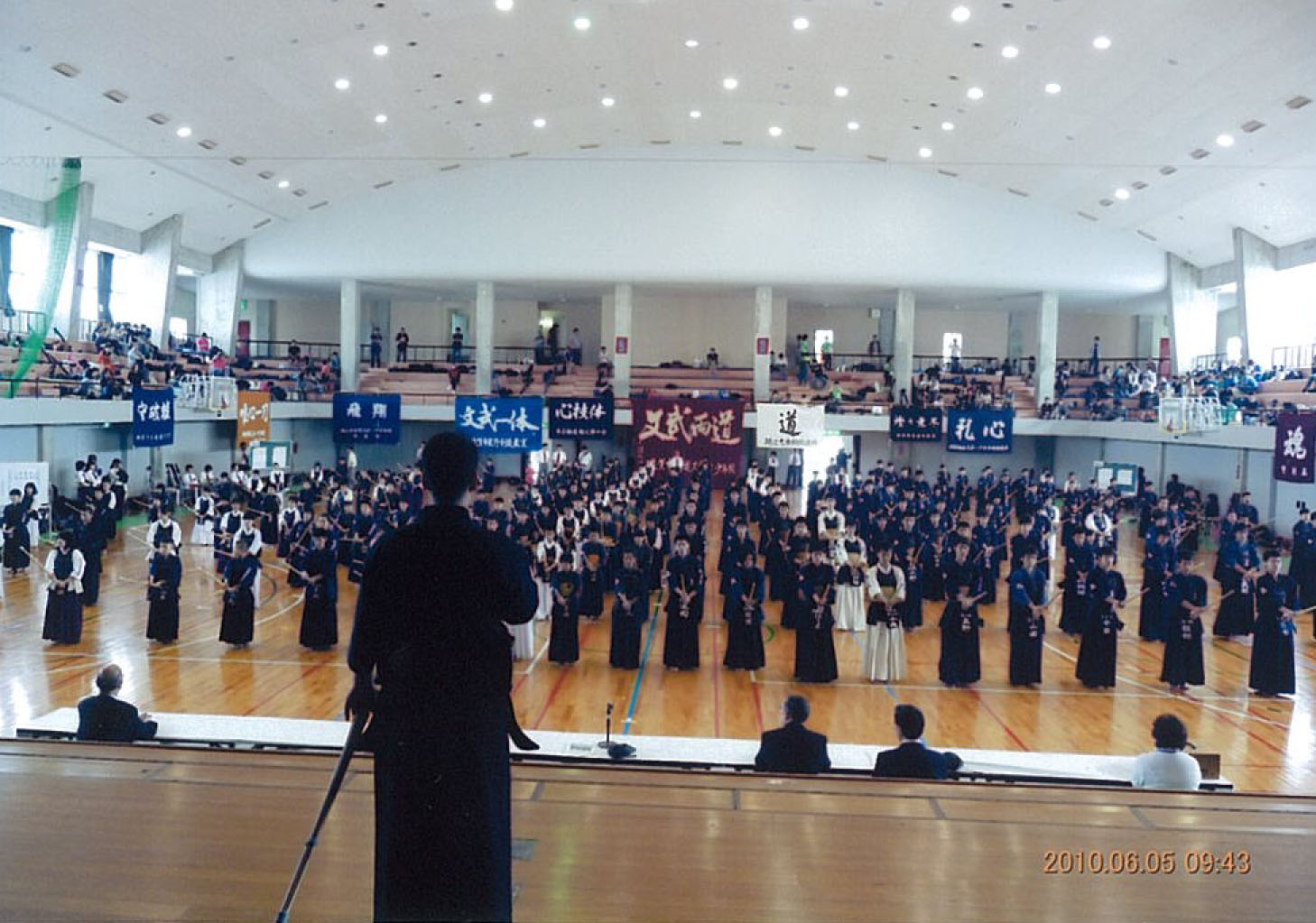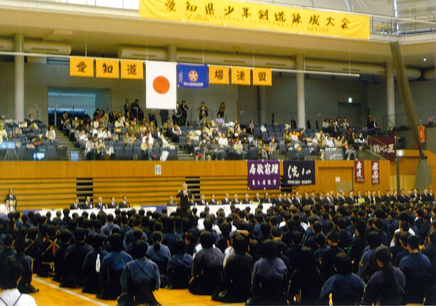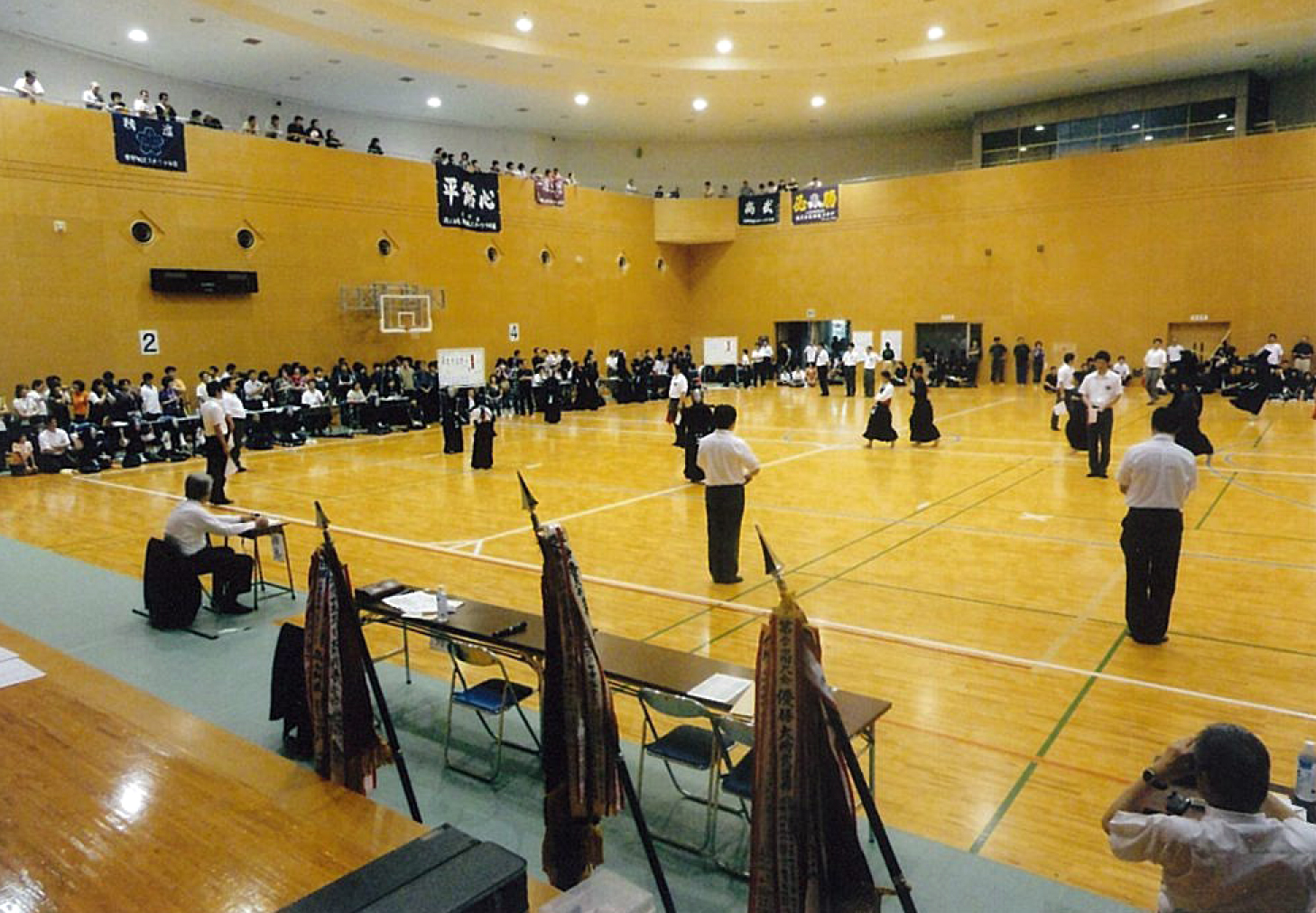 | 大会当日6月6日(日)午前7時己斐鯉城館父兄37名、広銀の森体育館に集合し、受付の準備にかかる。8時50分審判会議、9時10分開会に先立ち、優秀剣道少年団員の表彰を行った。9時25分国武理事長の開会宣言、国家斉唱、優勝旗返還、名越会長挨拶、山田議員の祝辞、會田審判長の説辞、桐木選手の宣誓の後、女子個人戦より試合に入った。16時50分試合が終了し、表彰の後、審判員の講評、山中副会長の挨拶、国武理事長の閉会宣言の後、鯉城館々員により、後片付けを行い7時10分無事終了致しました。 |