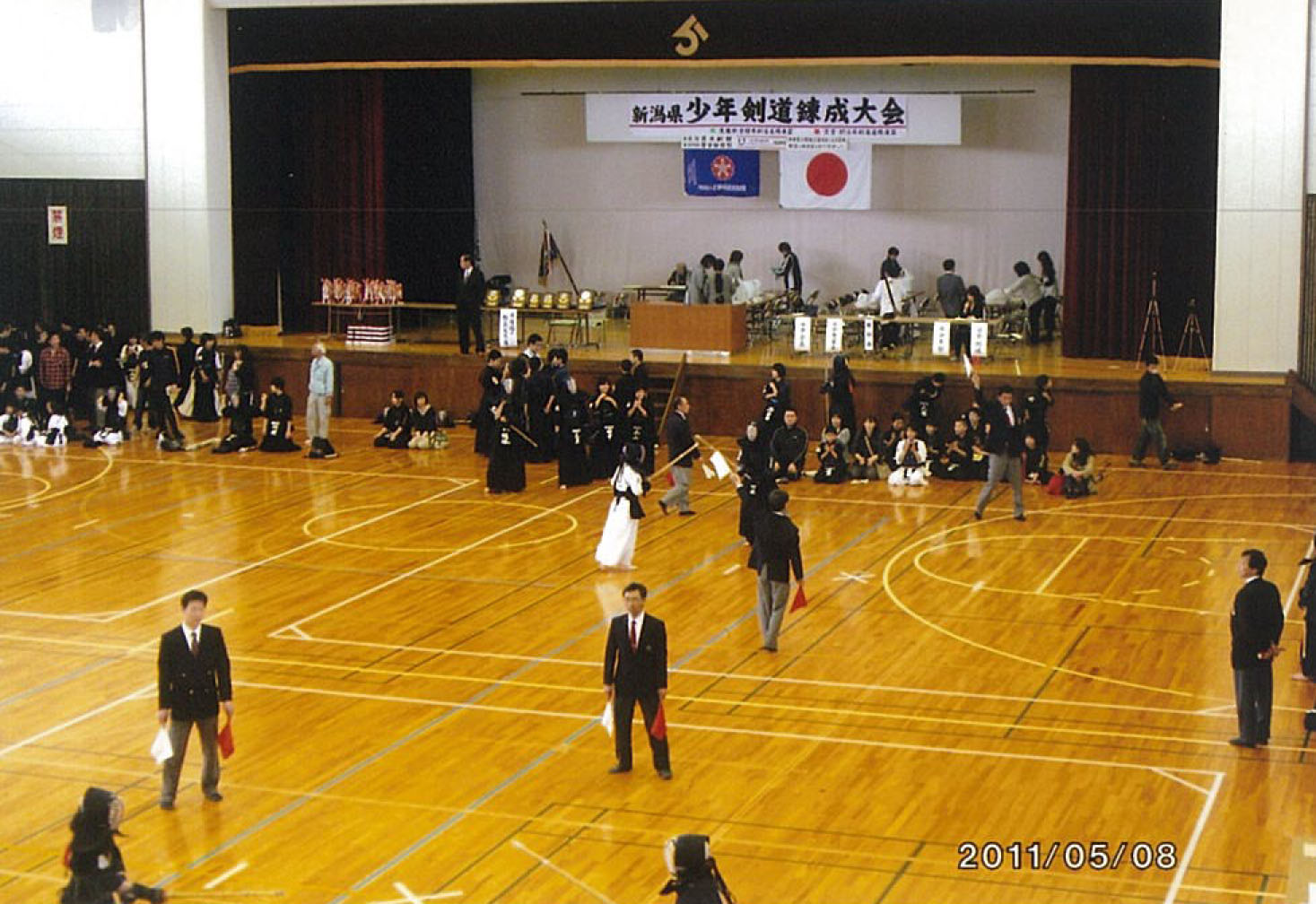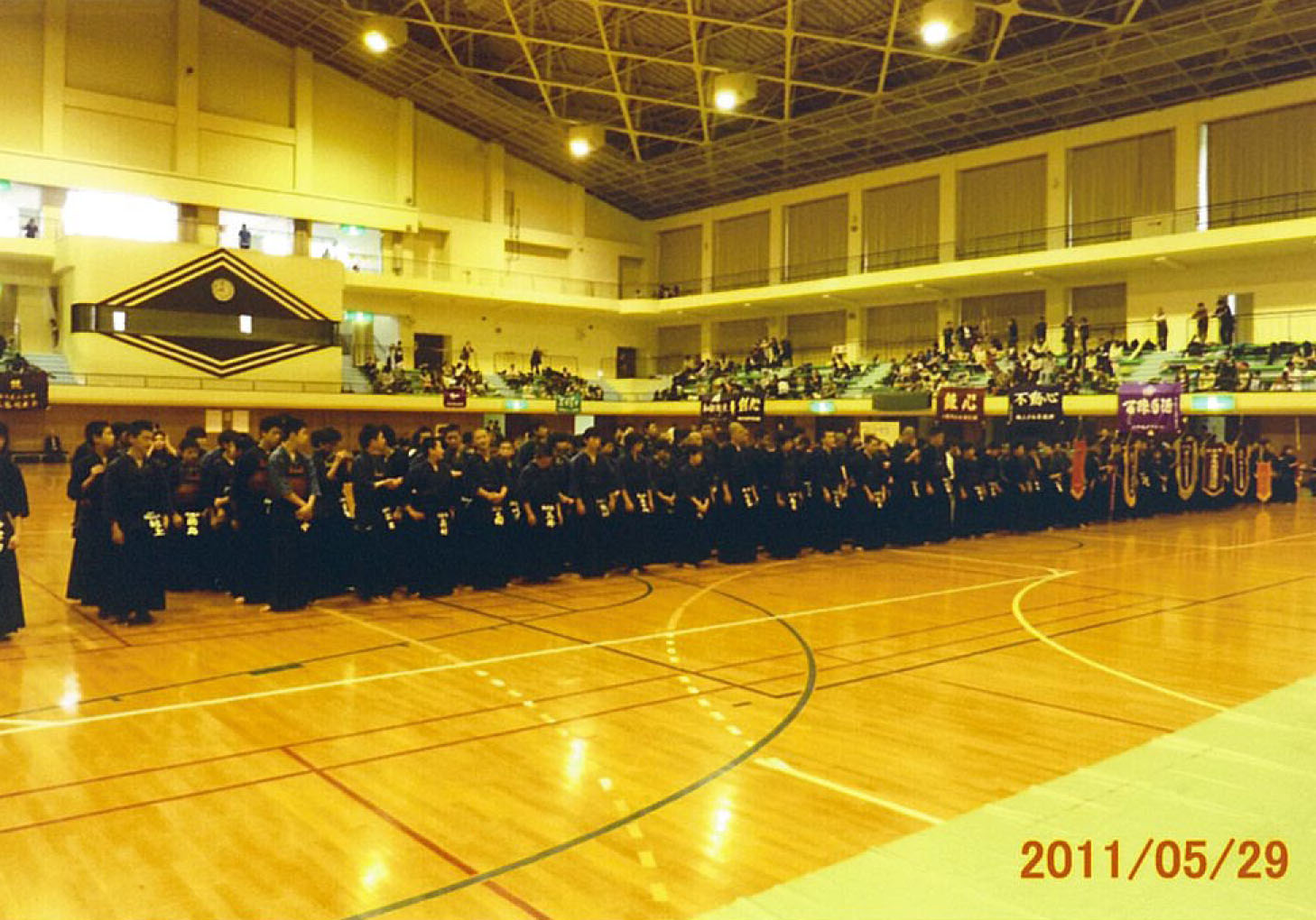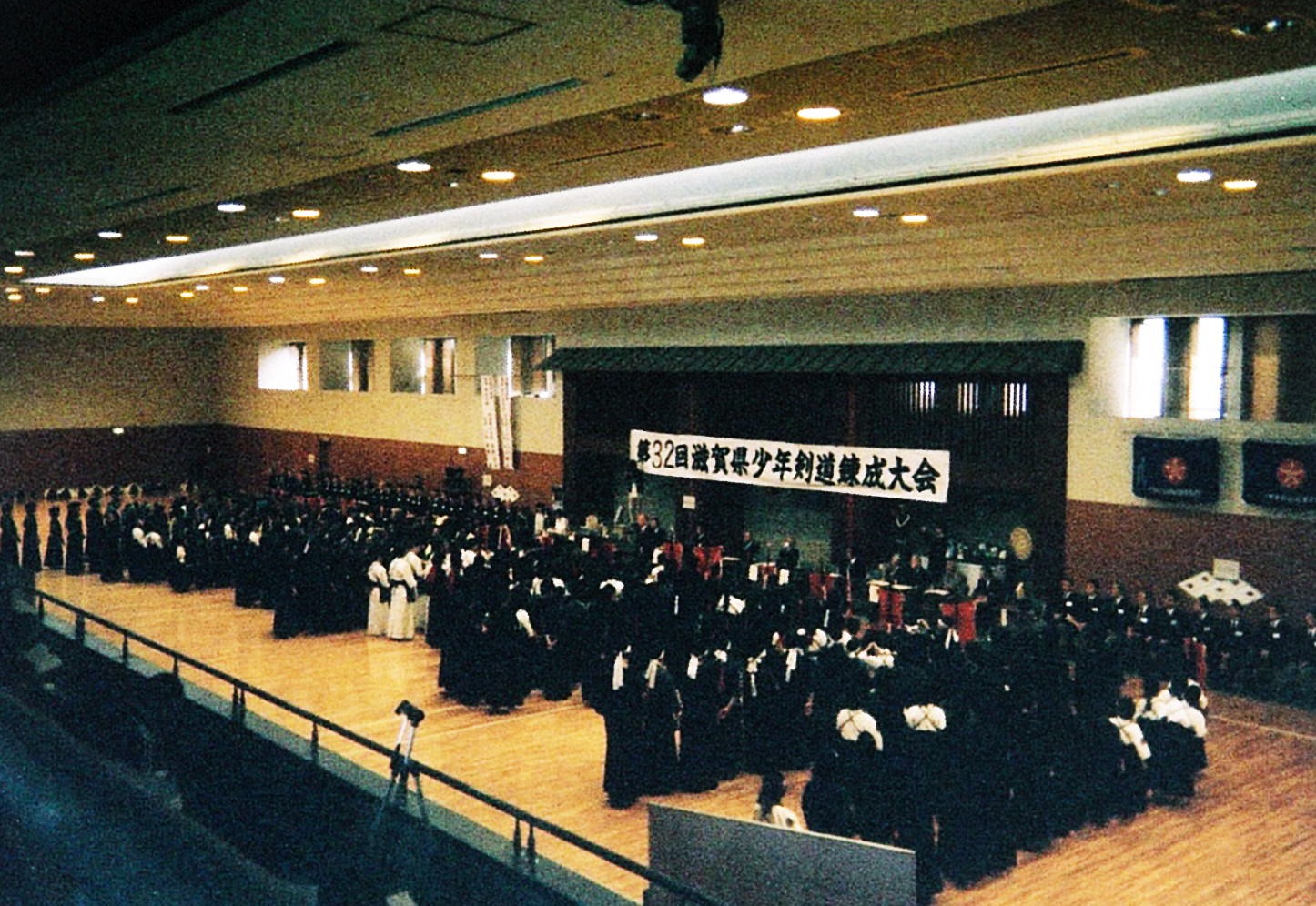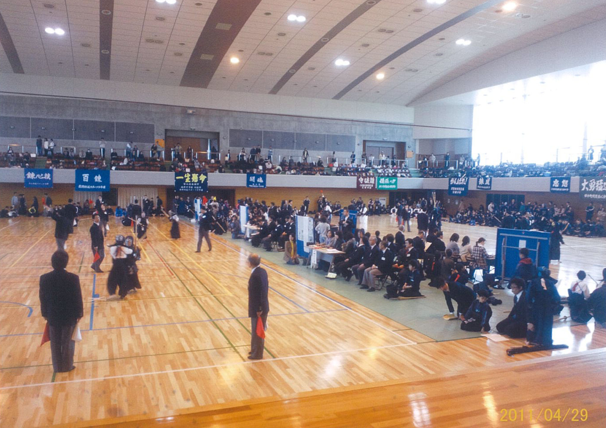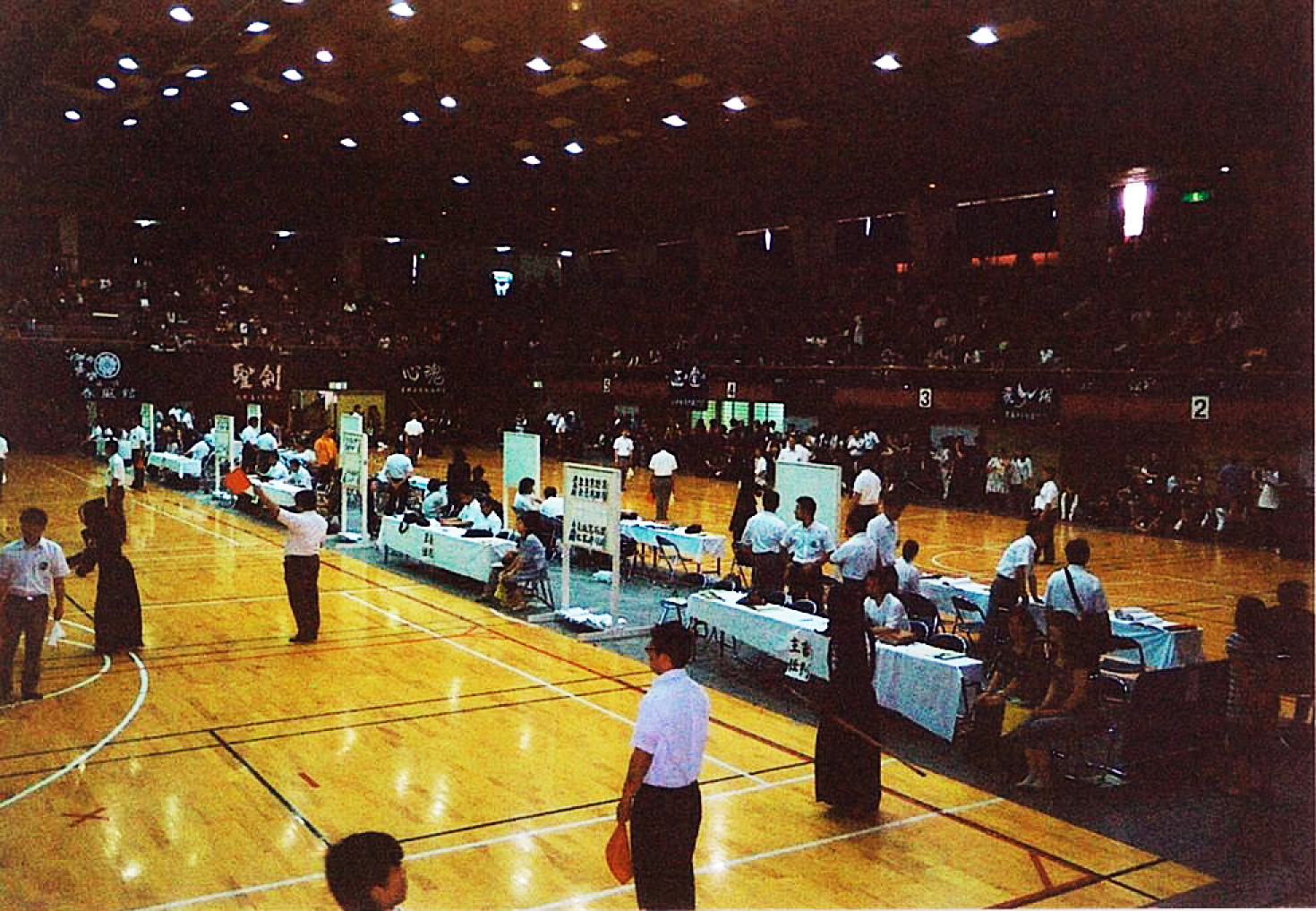 | 大会当日6月6日(日)午前7時己斐鯉城館父兄37名、広銀の森体育館に集合し、受付の準備にかかる。8時50分審判会議、9時10分開会に先立ち、優秀剣道少年団員の表彰を行った。9時25分国武理事長の開会宣言、国家斉唱、優勝旗返還、名越会長挨拶、山田議員の祝辞、會田審判長の説辞、桐木選手の宣誓の後、女子個人戦より試合に入った。16時50分試合が終了し、表彰の後、審判員の講評、山中副会長の挨拶、国武理事長の閉会宣言の後、鯉城館々員により、後片付けを行い7時10分無事終了致しました。 |