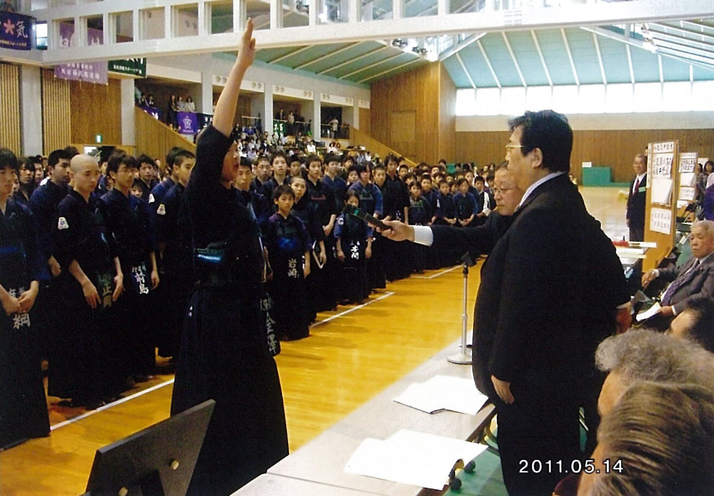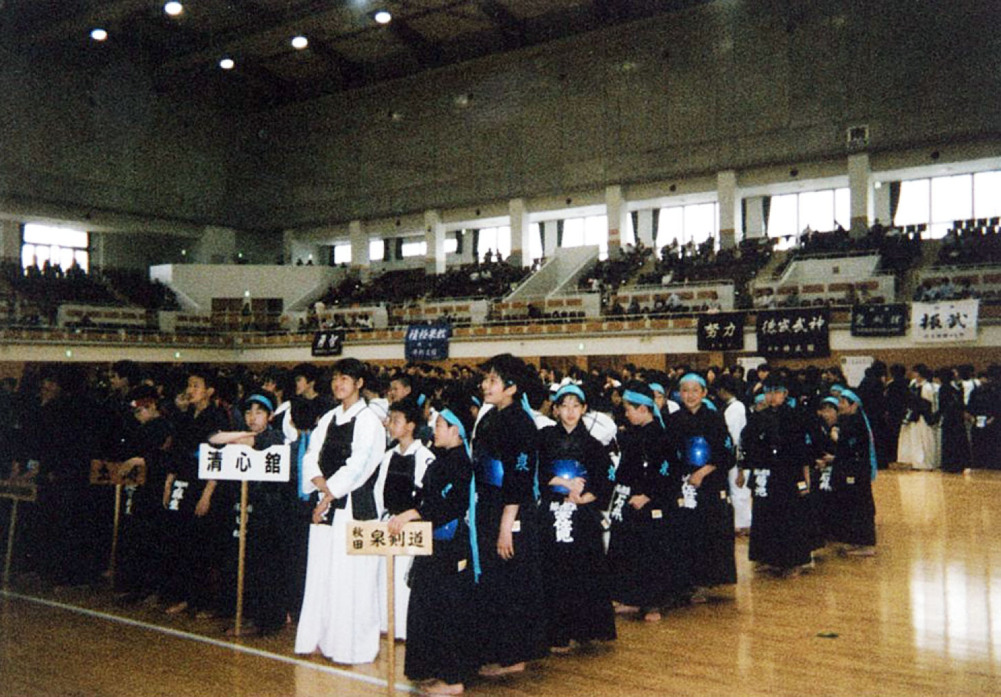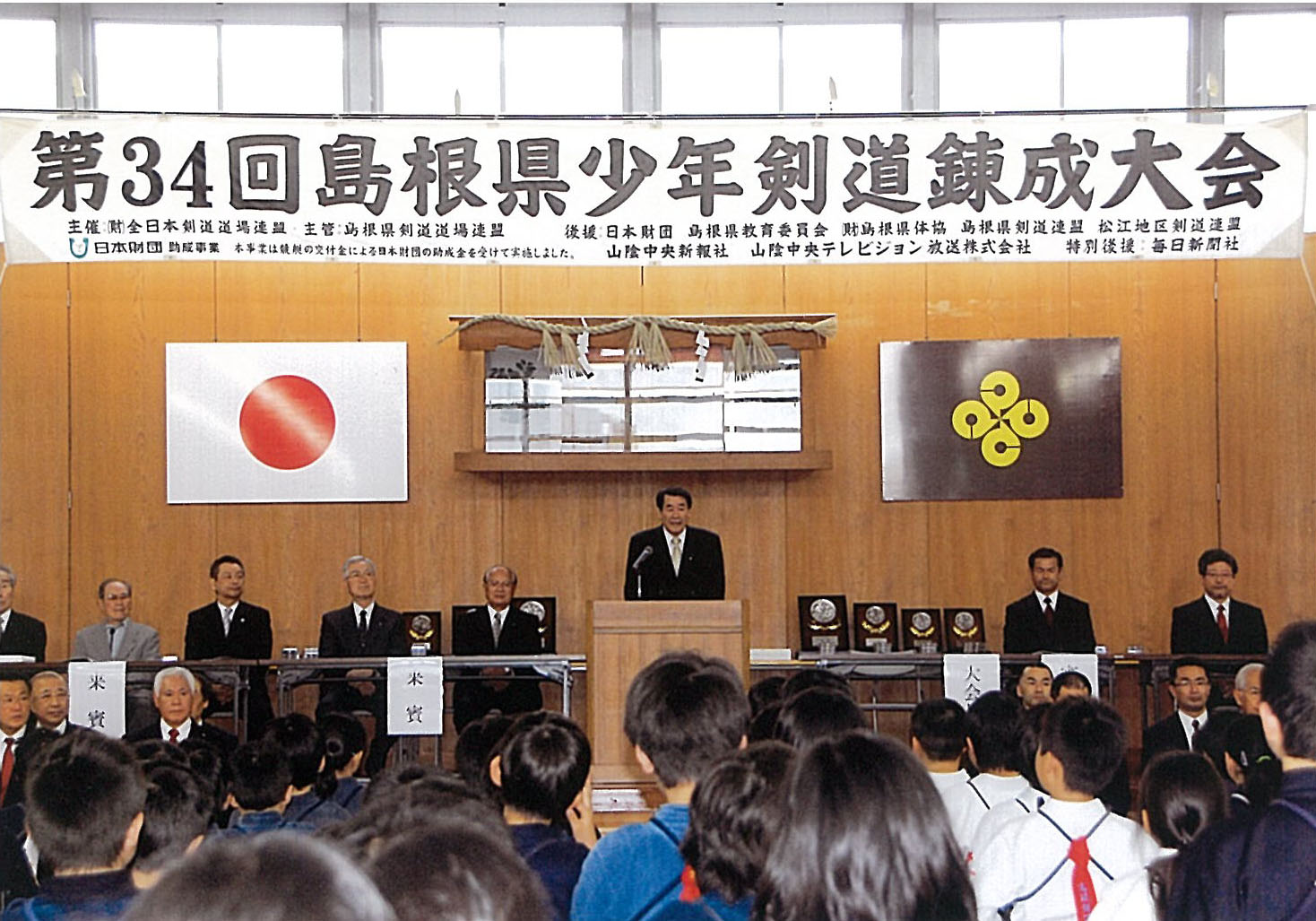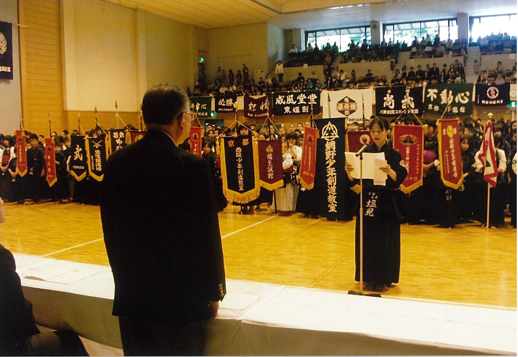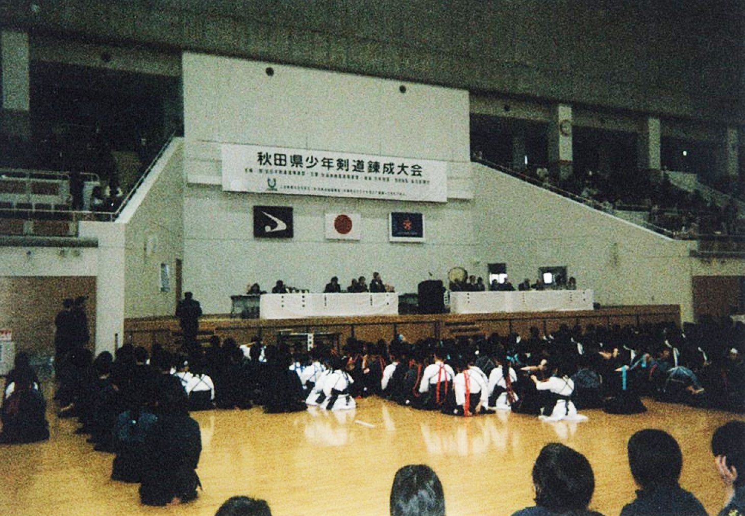 午前8時30分、原田源次先生(県剣連会長)、菊池啓一様(県防犯協専務理事)より、来賓祝辞をたまわり、審判長菅ア吉雄先生の説辞につづき、長沼友貴君(不動剣道豪気館)が選手宣誓を行い、閉会式終了後午前10時に試合錬成を開始した。 午後3時00分、第一会場において、小中学校の決勝戦を同時に行い、午後3時20分に全試合を終了、午後3時30分より表彰式、審判長菅ア吉雄先生より大会講評をたまわり、最後にア山貢(県道連会長)が閉会を宣言し、午後4時00、事故等なく全日程を完了した。 |