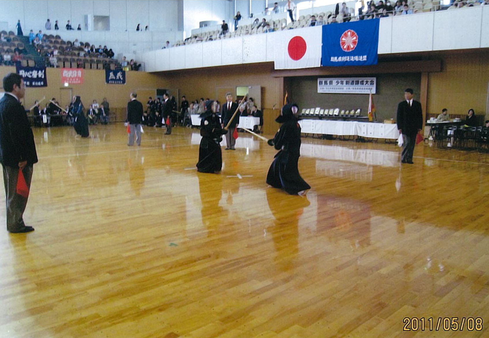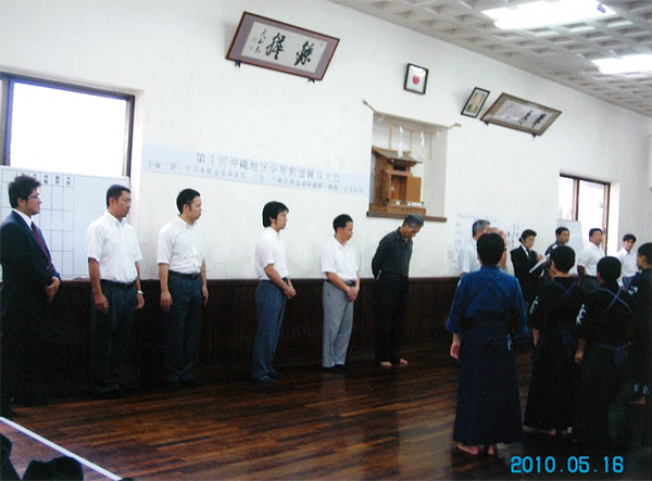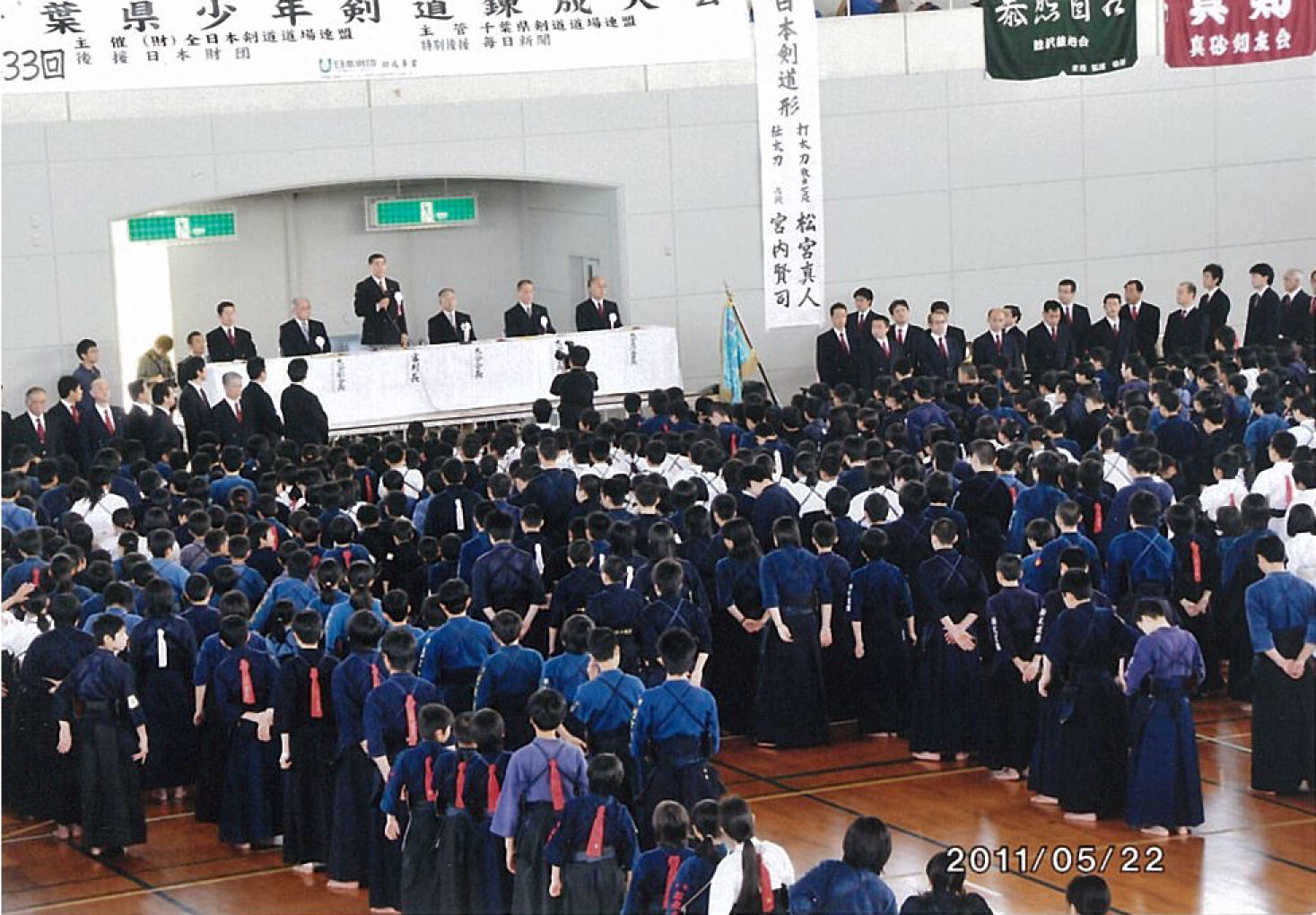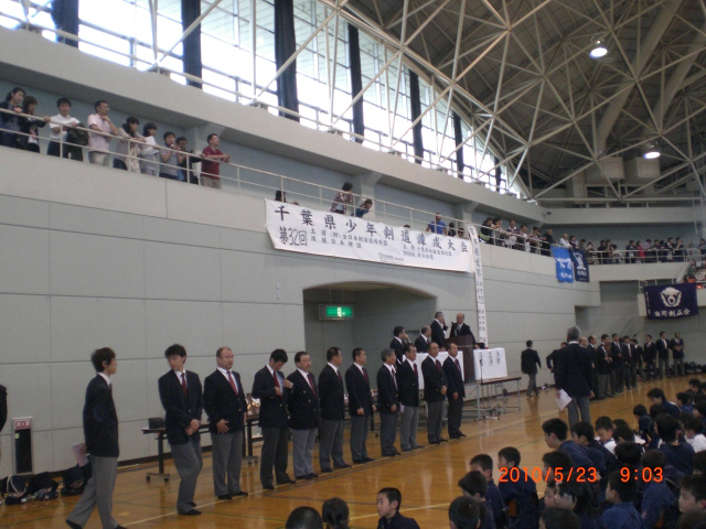 | 午前10時小松大道連副会長開会宣言 国家斉唱 大会会長挨拶小坂全道連会長のメッセージを井上大道連会長代行が代読、主管塚本会長挨拶後来賓橋敬明(社)大阪府剣道連盟副会長の祝辞を頂き、来賓出席者を紹介し、平成21年度優秀剣道少年団活動被表彰者指導顧問 長井正行、少年団員辻田依里子・福田紘子に対し表彰盾伝達。森審判長の試合場の注意、選手代表小曽根剣友会 小田選手の宣誓10時35分開会式終了。第1・2・3試合場小学生、第4・5・6試合場中学生の部に別れ、10時45分審判長の合図で女子個人試合、男子個人試合、団体試合の順でトーナメント法で試合を開始、それぞれの試合場で熱戦が展開された。全試合午後4時40分終了。直ちに成績発表並びに表彰式、個人戦は1位、2位、3位に対し大阪府剣道連盟の賞状と大道連の賞状授与。団体戦1位・2位・3位に対し全日本剣道道場連盟の症状と表彰盾及び大道連の賞状及びメダルを授与した。閉会の挨拶を富永大道連副会長が行い、国旗に礼、石橋大道連理事長が閉会宣言。午後5時20分大会無事終了。大会役員は使用した第1・2体育館・多目的室・会議室等清掃を行い解散した。 |