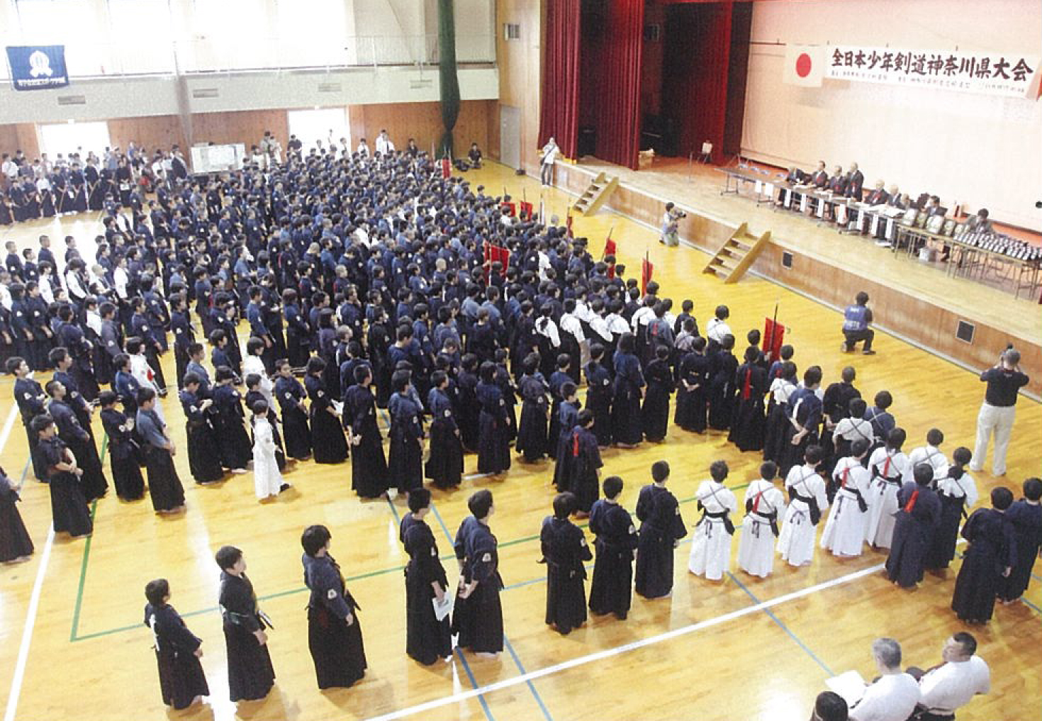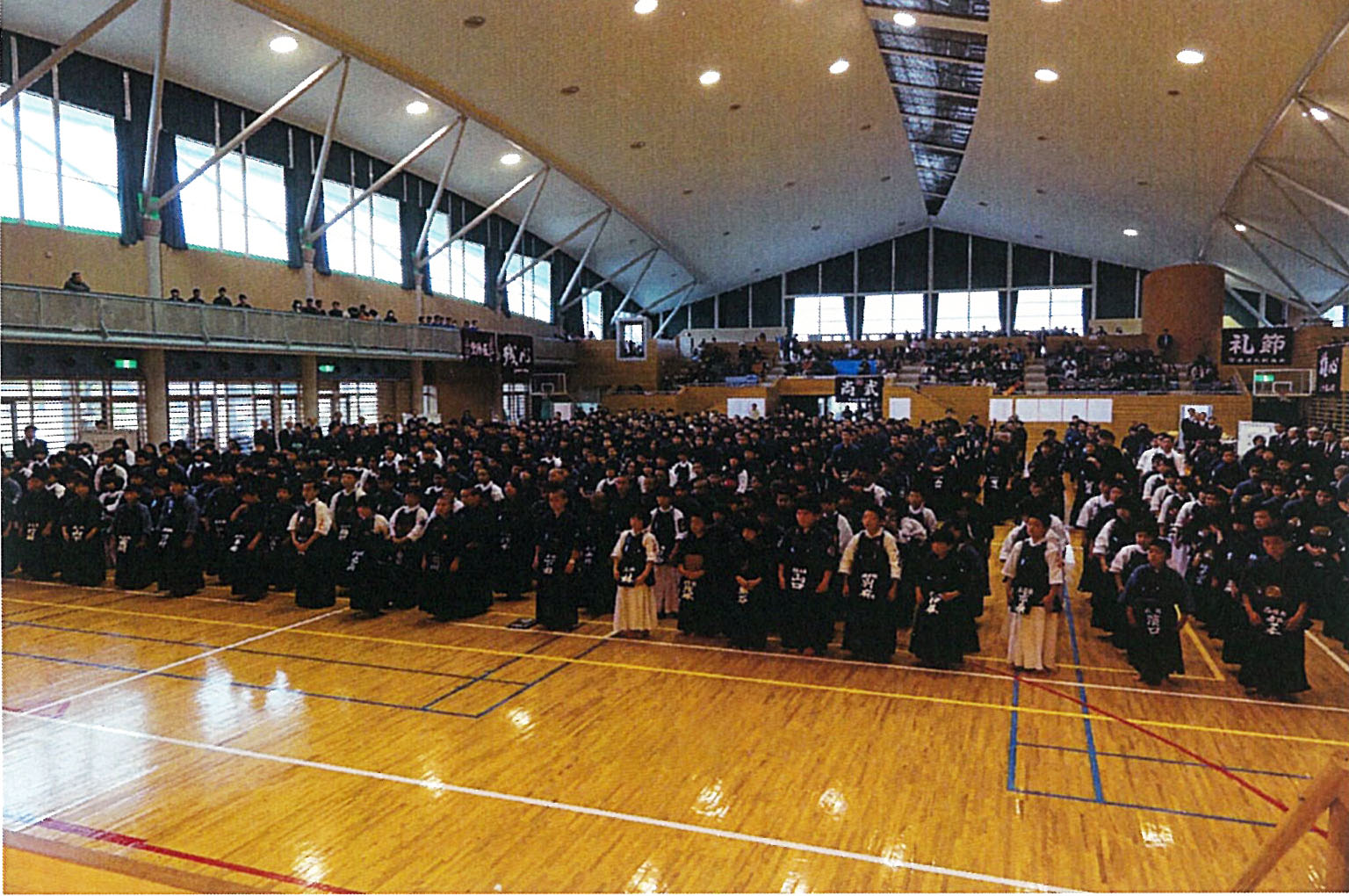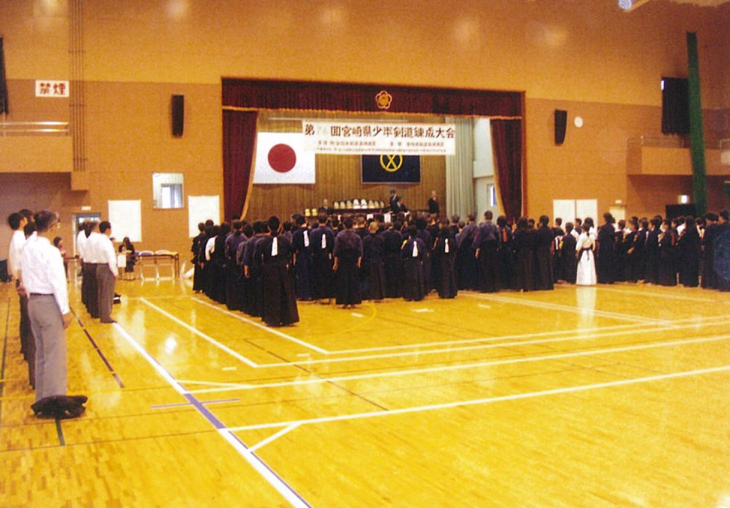 | 整然とした入場行進から始まり、厳粛な雰囲気の中で開会式が行われ、選手たちの健闘が期待できるものであった。その後の試合は,各道場全国大会出場を目指し、一戦一戦が白熱した試合を繰り広げ、日頃の厳しい稽古の成果が遺憾なく発揮されていた。 |